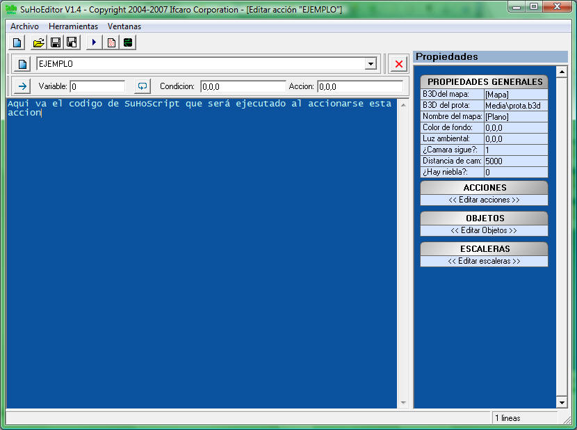 Con el SuHoEditor se crean los objetos y las acciones que tendrá cada escenario, entre otras cosas. En el nuevo SuHoEditor se han suprimido las entidades especificas (acciones, acciones especiales y puertas) y se han remplazado por acciones generales que el nuevo Proyecto SuHo v3 es capaz de diferenciar.